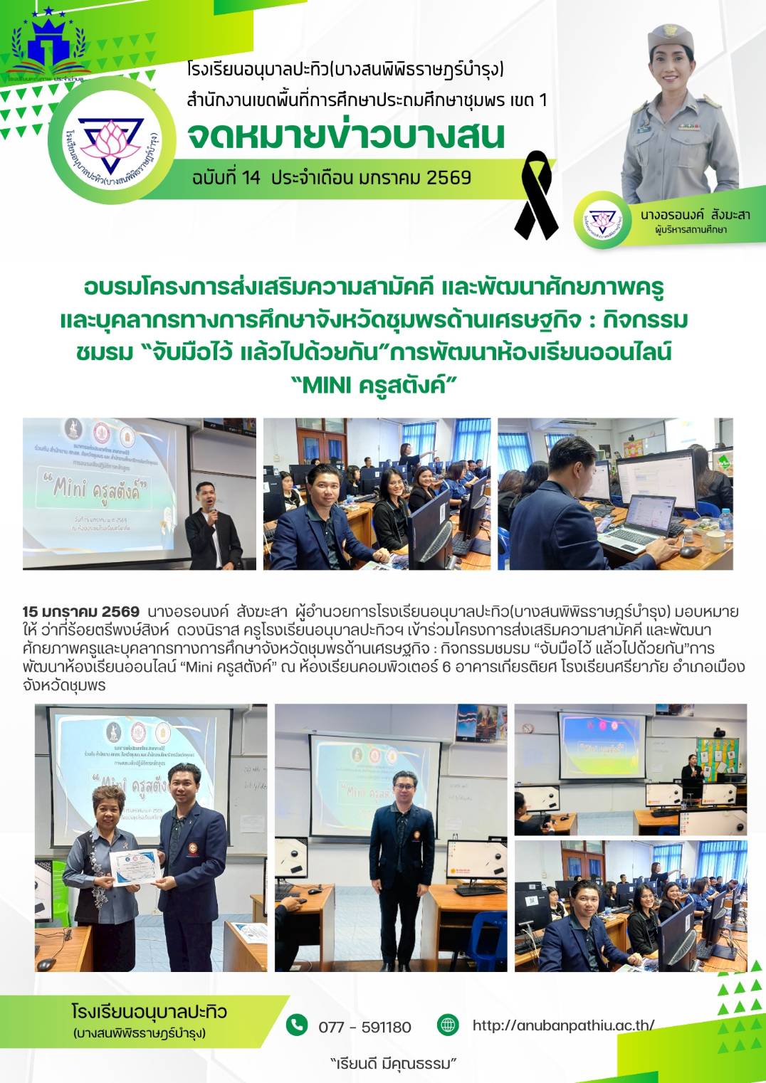 อบรมโครงการส่งเสริมความสามัคคี และพัฒนาศักยภาพครู และบุคลากรทางการศึกษาจังหวัดชุมพรด้านเศรษฐกิจ : กิจกรรมชมรม “จับมือไว้ แล้วไปด้วยกัน”การพัฒนาห้องเรียนออนไลน์ “Mini ครูสตังค์”